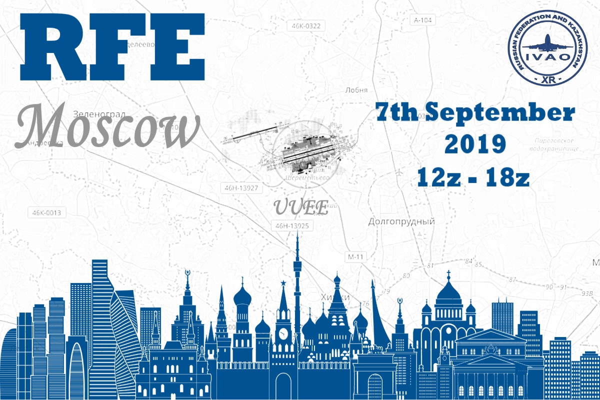 По случаю празднования дня города Москвы, российский дивизион IVAO с радостью представляет вам грандиозное мероприятие первой субботы сентября – Moscow RFE 2019. Приглашаем Вас отпраздновать 872-ю годовщину нашей столицы, посетив аэропорт Шереметьево с 12z до 18z! В вашем распоряжении 350 рейсов в самой загруженной воздушной гавани страны, полный диспетчерский контроль, ну и конечно же приветливое небо России.
