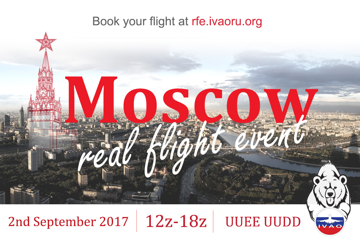 По случаю празднования юбилея города Москвы, российский дивизион IVAO с радостью представляет вам грандиозное мероприятие первой субботы сентября – RFE MOSCOW 2017. Приглашаем Вас отпраздновать 870-ю годовщину нашей столицы, посетив аэропорты Шереметьево и Домодедово с 12z до 18z! В вашем распоряжении свыше 350 рейсов в самых загруженных воздушных гаванях страны, полный диспетчерский контроль, и приветливое российское небо.Бронируйте ваши рейсы, знакомьтесь с брифингом на специальном сайте RFE MOSCOW 2017 и поднимайте ваших стальных птиц в небеса! Мы с нетерпением ждем встречи с Вами!